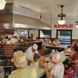 Apple Pan was established in 1947 in West LA. Not much has changed with Apple Pan. The most noticeable differences is that they accept Apple Pay/Credit Cards making it much more efficient and convenient. They no longer serve soft drinks in the paper cone. Seating is still done on a first come, first serve basis. You can expect to wait for awhile depending on the time of the day. The counter ladies serve ketchup for you on a separate plate for your fries. If you get a middle seat you can watch them cook your burgers in front of you. The burgers are very good in my humble opinion. You can order either a hickory burger or steak burger. They offer to upgrade it to a cheeseburger if you'd like. The hickory sauce has a very nice tangy flavor to it. There's a fresh crisp bite from iceberg lettuce with the pickles adding a sour crunch to the burger as well. It's just a good old-fashioned American style burger. The fries are very good here. It's not easy to find good fries that taste good or their own. These are your run of the mill basic french fries that are crispy and delicious. Make sure you don't fill up on fries as you'll want save room for the delicious pies served à la mode. The real star of the show are the pies. All their pies are homemade using old family recipes. I was told that the regulars enjoy the Banana Cream Pie and Apple Pie the most. I opted to get an Apple Pie with my wife and son shared a seasonal Strawberry Pie (Which was also recommended). The Strawberry Pie is so fresh and delicious. They use big pieces of fresh strawberries. This is the pie I would recommend you order if they have it. The Apple Pie is good, but it's your standard apple pan. It didn't Wow me! I enjoyed it nevertheless. I will definitely be back to The Apple Pan again. It was great eating experience.